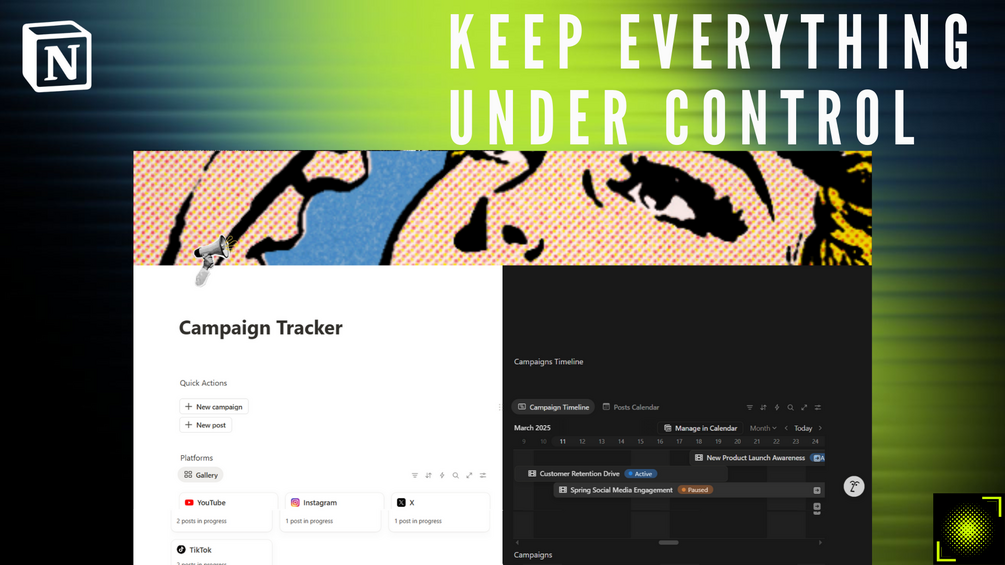 This Notion template for marketers, freelancers, and digital teams simplifies campaign performance tracking, helping you make data-driven decisions and improve ROI and overall results.