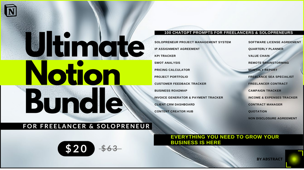 The Ultimate Notion Bundle for Freelancer & Solopreneur is the only toolkit you need to organize, scale, and take your business to the next level.